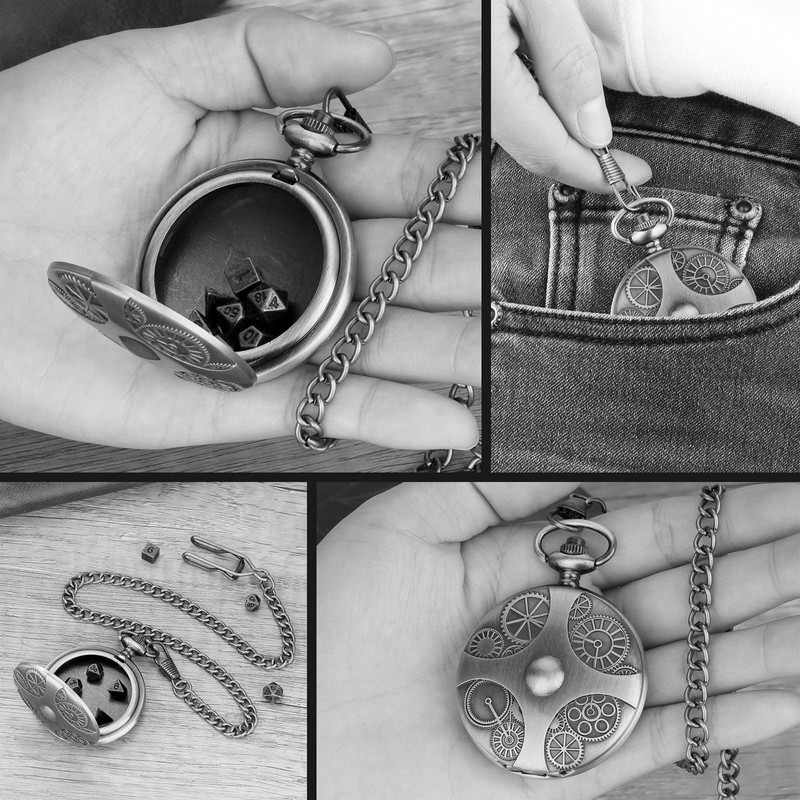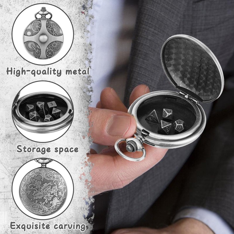 - Package list: This metal dice contains several cubes in different shapes, with a steampunk style pocket watch box, perfect for storing these small cubes inside. No matter where you are, you can take this d&d cube set with you without additional strain.