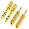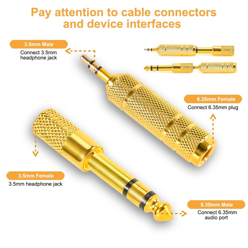 - MULTI-FUNCTIONAL COMBINATION: This product has 4 adapters, divided into 2 types, 2 of each type. Among them, the 6.35mm male to 3.5mm female plug adapter is suitable for accessing audio devices with 6.35mm plugs, such as amplifiers, electric guitars/pianos, stereo systems and so on. And the 3.5mm male to 6.35mm female plug adapter is suitable for connecting 3.5mm (1/8-inch) stereo equipment to headphones with standard 6.35mm (1/4-inch) plug.