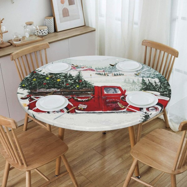 QALFKAD Christmas Red Truck Fitted Round Christmas Tablecloth, Farmhouse Elastic Edge Table Cover Waterproof for Kitchen Dinning Party Patio Table Decor, Fit Round Table Up 45"-50" Diameter