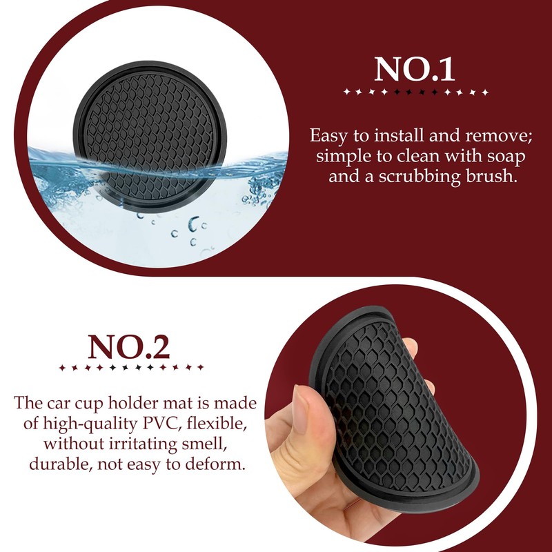 - Durable and Easy to Clean: The car cup holder mat is made of high-quality PVC, flexible, without irritating smell, durable, not easy to deform, waterproof and dustproof. Easy to install and remove; simple to clean with soap and a scrubbing brush.