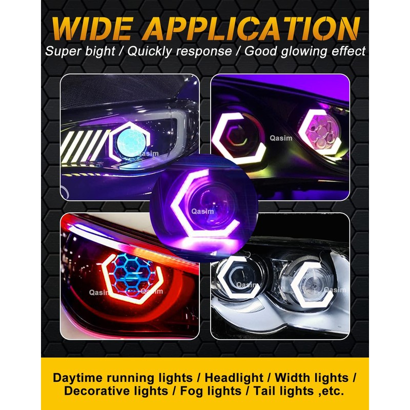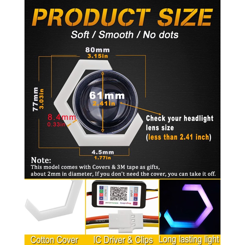 - >> Decoration: As long as your car/motorcycle/truck/pickup/farm vehicle/SUV/speaker and so on headlight has enough space, you can install it. You can add our Hexagon angel eyes to the projector shield to decorate your car/motorcycle, which will add a stylish and unique look to your car lights.