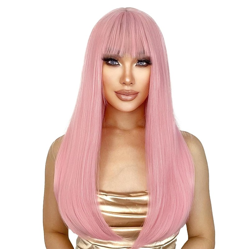 QAUARUMSUN 26 Inch Pink Wig With Bangs Long Wavy Wigs for Women Curly Wavy Wig With Bangs Natural Looking Synthetic Heat Resistant Fiber Wig for Daily Party Use