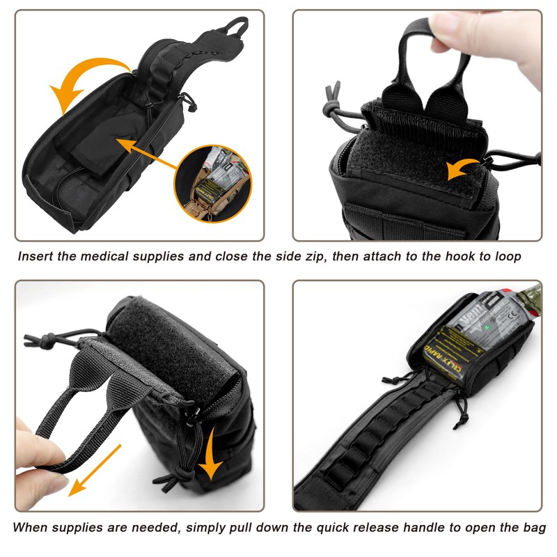 Crafted from durable materials, this empty first aid bag offers ample space to store your medical supplies securely.  Medical Trauma Kit Bag versatile design allows for easy attachment to backpacks or belts, ensuring that you can access your essentials whenever needed.  The quick release handle provides effortless deployment in critical situations, making MED Pouch perfect for first responders and EMTs