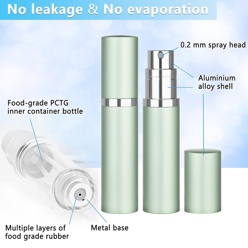 - No leakage: The bottle is made up of an aluminium alloy shell, a food-grade PCTG container and a metal base. The base is tightly wrapped with multiple layers of food grade rubber so that the perfume won't leak. No need to worry about the perfume leaking into your handbag