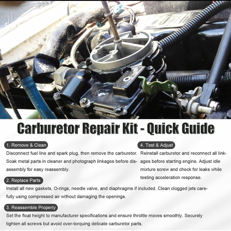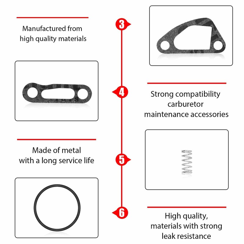 Designed to eliminate carburetor leaks and optimize fuel delivery, this kit restores carburetor function for improved engine performance—including better fuel economy, smoother acceleration, and faster cold starts—bringing your engine to peak operating conditions quickly.