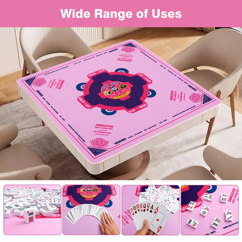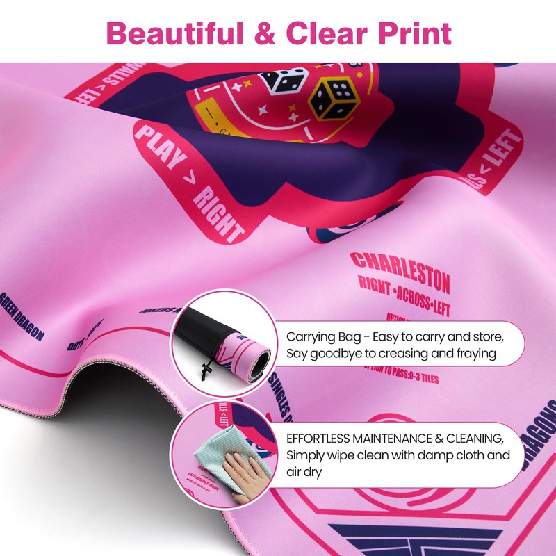 • BEAUTIFUL & NON-FADING PRINTS: Clear and stylish patterns are fade-resistant, Utilize advanced printing technology and premium materials to ensure precise and detailed designs. Mahjong mat with rules pink with storage bag, Easy to roll up, the mahjong mats and put it into the black carrying bag for carrying and storage when not in use or traveling.