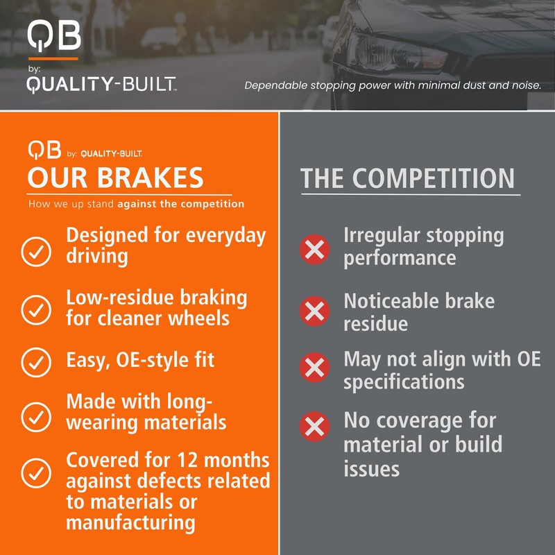 • QUALITY YOU CAN DEPEND ON: A budget-friendly choice without sacrificing quality. QB by Quality-Built brake pads are built to deliver reliable stopping power and longevity, making them perfect for daily-driver cars.