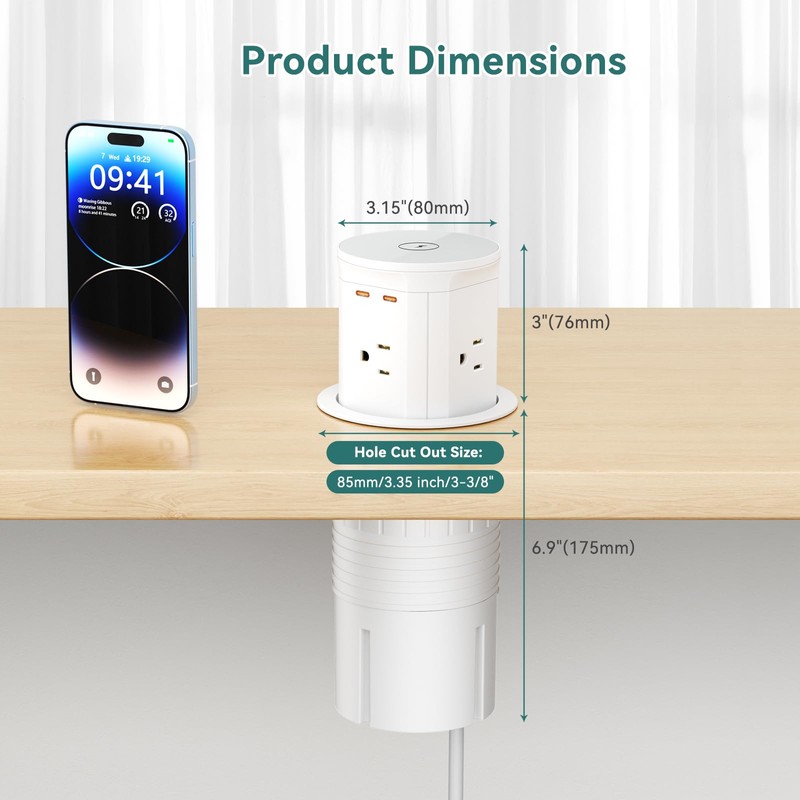 - 【Easy To Install】Cut a 3.35 inch (85mm) hole on the table, remove the ring and slide the socket body from the top, tighten up the ring from the bottom. Easy to set up in granite countertop, kitchen island, office, conference room and so on. Please note there must be a 7 inch space under the table.