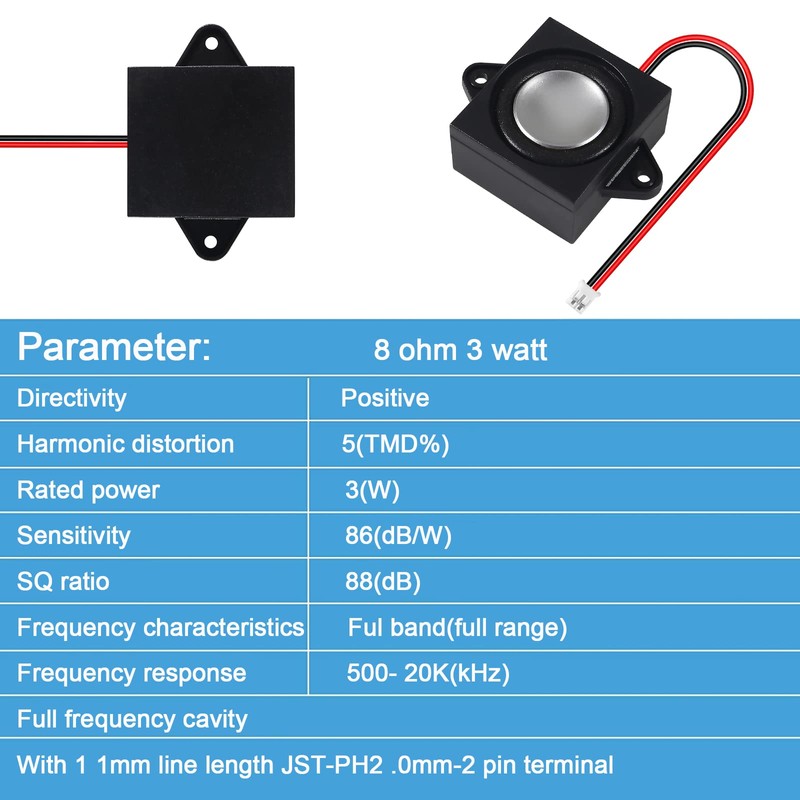 • 8 ohm 3 watt Portable Mini speakers with JST-PH2.0mm-2 pin terminal, can choose 3.3V or 5V; Full frequency cavity.