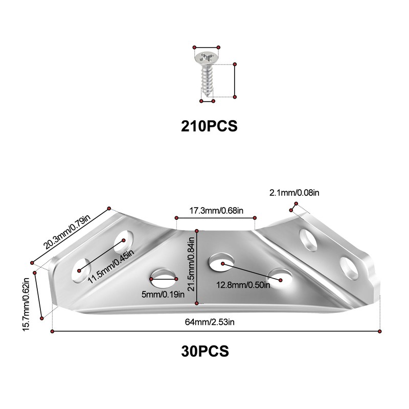 - 🛒Size: Length: 2.53in(64mm), Width: 0.79in(20.3mm) , Thickness: 0.08in(2mm), Hole Distance: 0.5in(12.8mm) , Packing list: Brackets x 30pcs, Screws x 210pcs