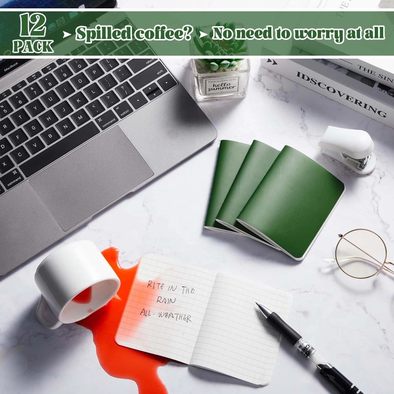 Generous Quantity and Ample Space: enjoy abundant writing space with our set of 12 waterproof pocket notebooks, with the cover colored in green, each providing 32 sheets, 64 pages; With this ample quantity at your disposal, you can dedicate different notebooks to various tasks or projects; Our weatherproof field notebooks offer you abundant quantity, presenting you with plenty of room for your thoughts; Please note, gel pens might come off when exposed to water