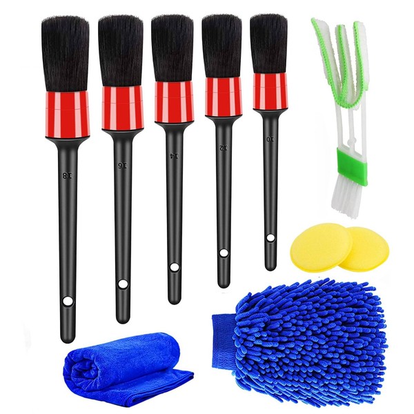- 【10 Pieces Car Detailing Brush Set】This car detailing brush set includes 5 x detailing brushes, 1 x car wash mitt, 1 x double head air vent cleaning brush, 1 x microfiber towels, 2 x wax applicator pads. This car cleaning kit covers all interior and exterior cleaning needs to help you achieve a flawless car. Save your work and simplify the annoying daily cleaning