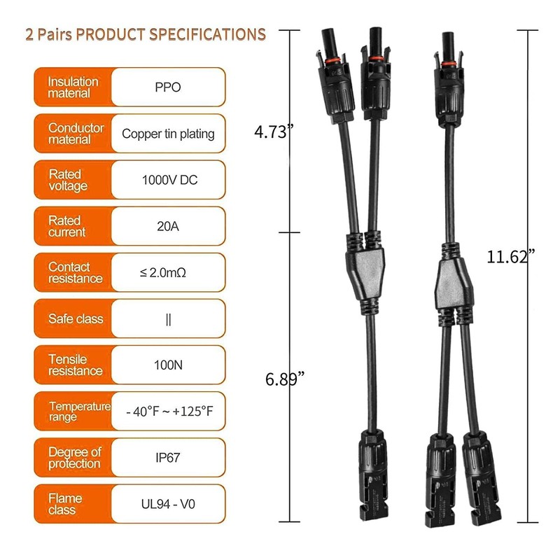 - 💕【2 Pairs Solar Panel Y Branch Parallel Cable] The Y Branch Solar Panel Cable Connector length is 11.8 inches, Connector Y Branch Parallel Cable can be used to parallel 2 solar panels and solar combiner boxes to meet your needs to expand your solar panel system. Suitable Single Core Cable Section: 1.5mm² - 6mm².