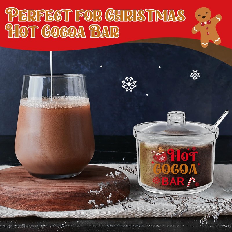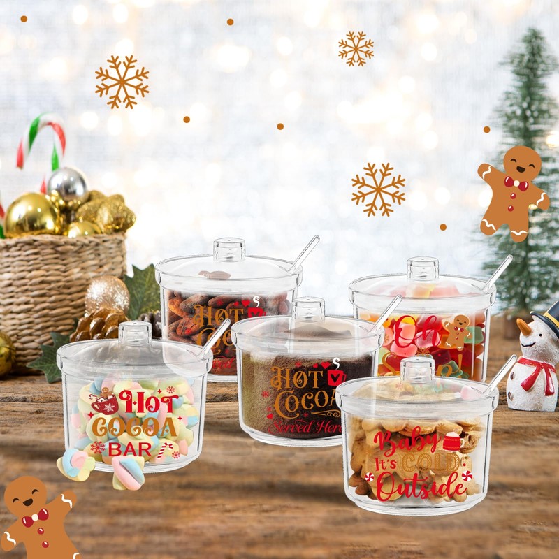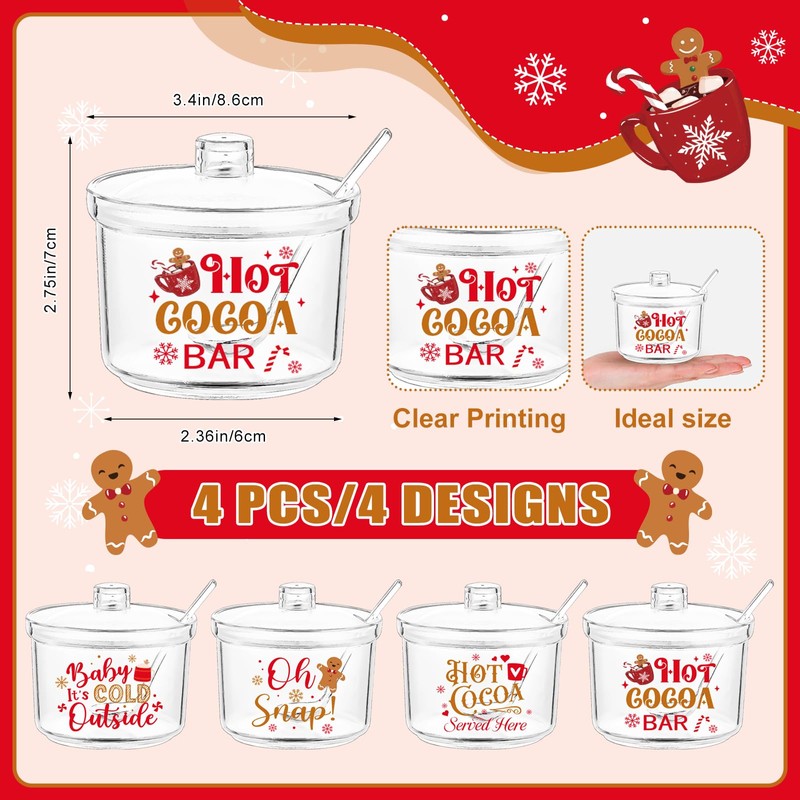 - [Package Includes]: This set includes four Christmas clear acrylic sugar bowls with lids and spoons to meet your needs. Whether you have a large family or enjoy entertaining, this set provides a plentiful supply of sugar, cocoa powder, or other seasonings all in one place