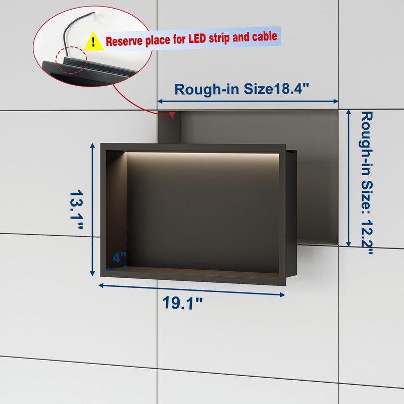 • 【Dimensions】Inner size of stainless steel shower niche is 18"H x 12"W x 4"D (Outside size: 19.1"H x 13.1" W x 4"D). Seamless welding ensures 100% leak-free and waterproof. 3000K warm light. 16ft power cord included.