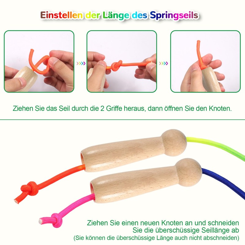 - High-quality design: the skipping rope is made of environmentally friendly materials, and the wooden handle is polished to be smooth and ergonomic, a 220 cm long high-quality and robust coloured nylon velvet rope that can be adjusted according to your own needs.