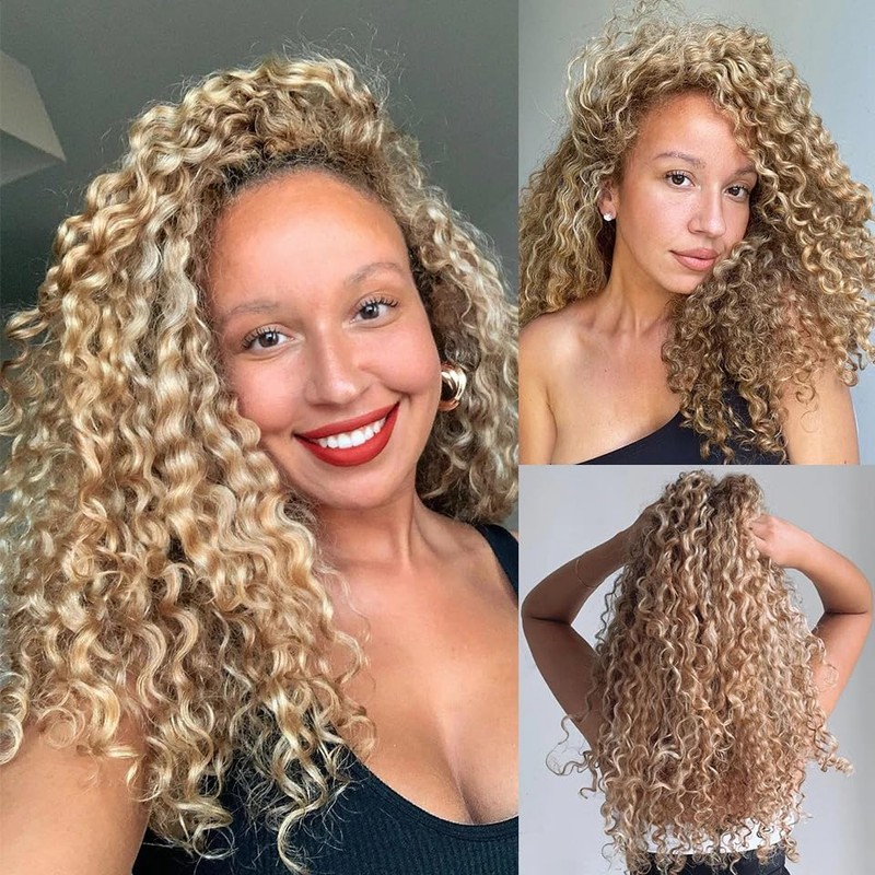 QEUOPE P27613 Highlight Kinkycurly Bundles Human Hair Ombre Two Tone Blonde Mixed With 613 Deep Curly Bundles Silky and Soft Double Weft Brazilian Hair Extensions 18 20 22 inch