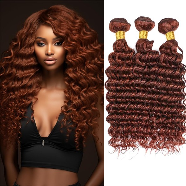QEUOPE Reddish Brown Deep Curly Wet and Wavy Bundles Color 33 Human Hair Copper Red Deep Wave Bundles Double Weft Brazilian Auburn Hair Extensions Silky and Soft (8 10 12 inch 3 Bundles)