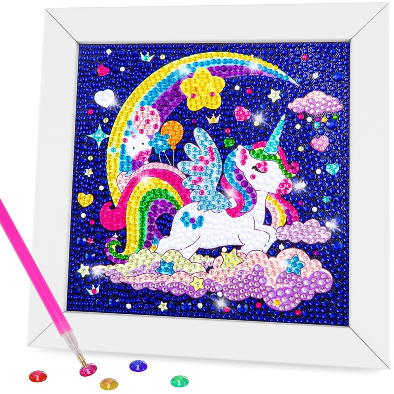 - Kids Diamond with Frame - Our kids kits comes with everything you need. The kits for kids includes pre-printed textured art canvas with the wooden frame, crystal diamonds, 2 pcs point drill pen, tray, mud and a beautiful packing box. Our kits with the pre framed is the great decor for placing on the table and hanging on the home wall, such as babyroom, living room and so on, perfect room decoration