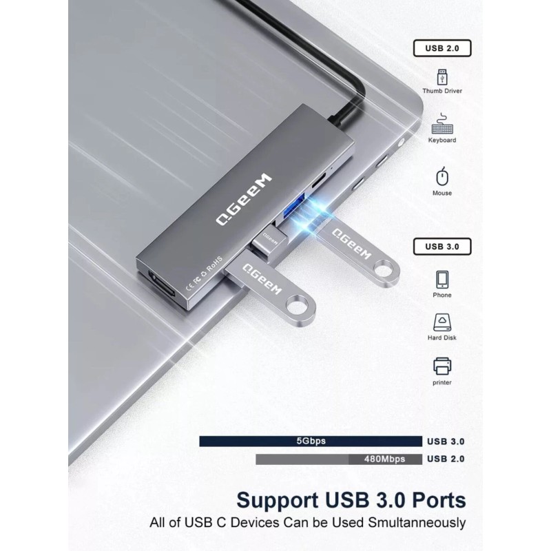 QGeeM USB C Hub 5 in 1 Multi-port Digital AV Adapter 4K HDMI 100W