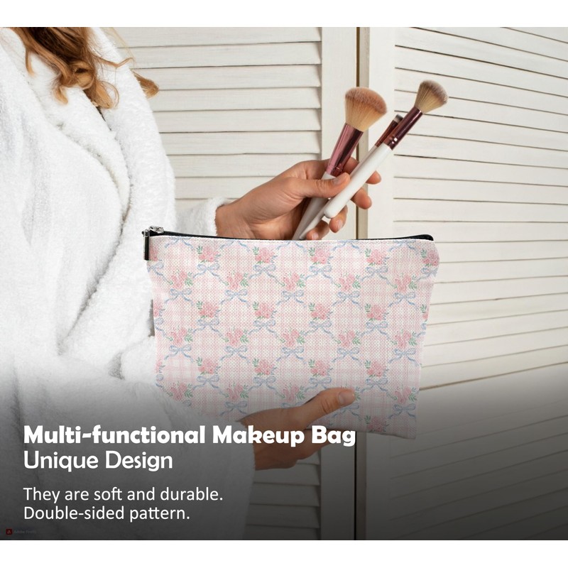 QGFM Coquette Blue Bow Rose Floral Makeup Bag, Coquette Pink and White Checkered Preppy Cosmetic Bags for Women, Preppy Girly Stuff, Aesthetic Pink Plaid Flower Zipper Makeup Pouch