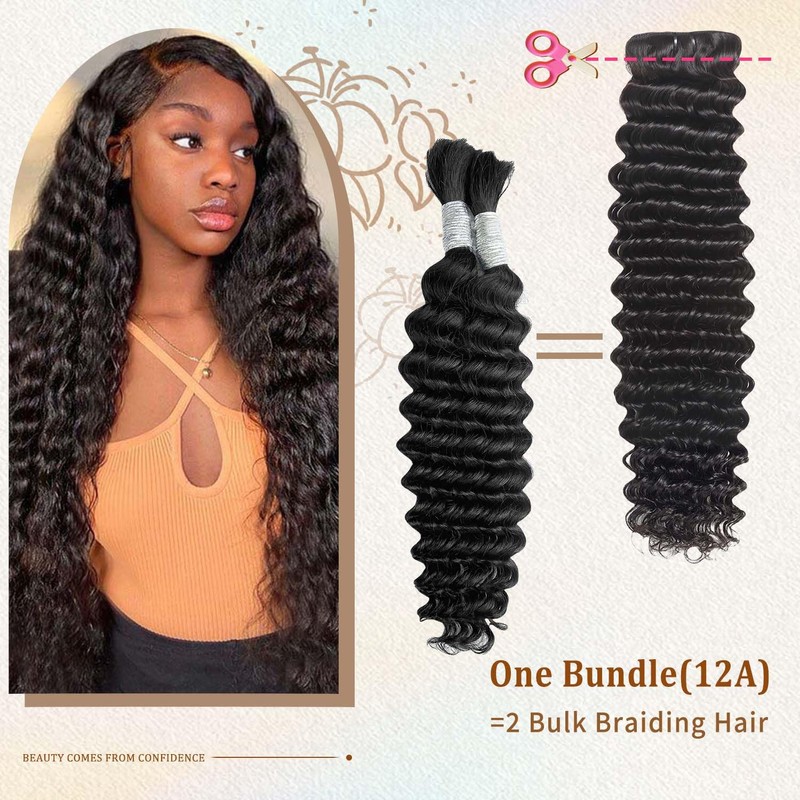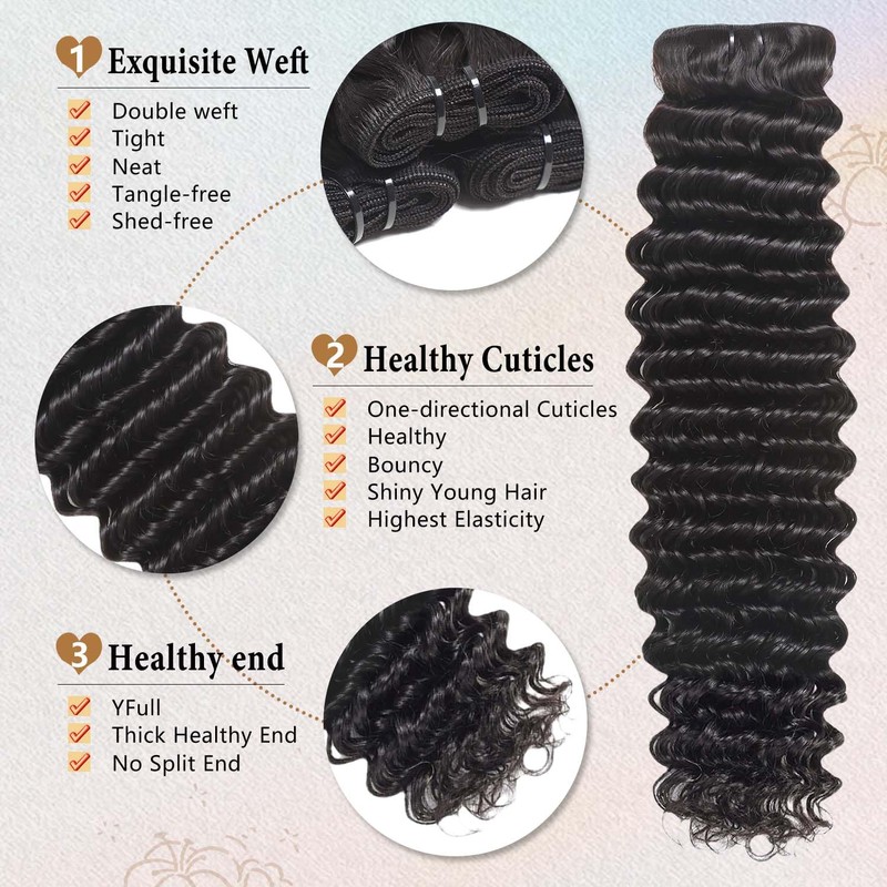 - Human Hair Bundles Material:100% Unprocessed Brazilian Virgin Human Hair Bundles Deep Wave Human Hair Bundles,Cut directly from the young girls,Soft and elastic, Healthy and Durable,Smooth and Comfortable