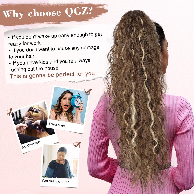 QGZ Claw Clip Ponytail Extension 30 inch Claw Clip in Ponytail Extensions for Women Long Wavy Curly Fluffy Pony Tails Hair Extensions Synthetic Hairpieces for Daily Party Use(Blonde Highlight)