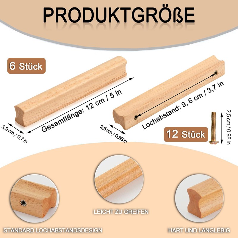 QHKLEW Pack of 6 Wooden Furniture Handles, Cabinet Handles Wood with Screws, Hole Spacing 96 mm, Wood Handles, Furniture Solid, Universal Wooden Handle, Kitchen Handles for Cabinets, Offices and