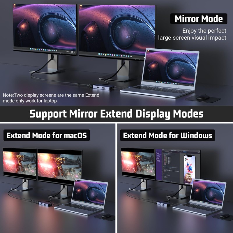 - Support dual monitors with Qhou USB C to HDMI VGA adapter: this USB C HUB adapter allows you to extend or mirror your laptop screen to two external displays with HDMI and VGA ports. Enjoy high-quality video output up to 4K@30Hz or 1080P@60Hz, making it perfect for presentations, video editing or gaming.