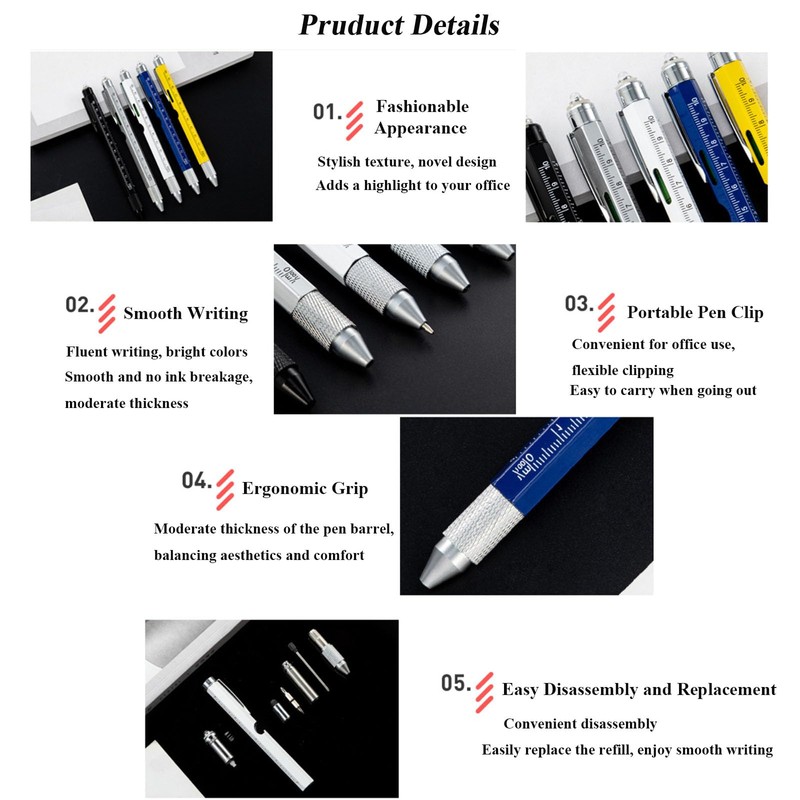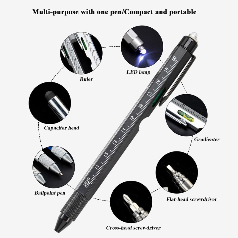 - 7-in-1 Tactical Pen: Equipped with a ballpoint pen, capacitive stylus, ruler, level, flat-head and cross-head screwdrivers, LED light, and bottle opener, this multitool pen offers all-in-one functionality. It’s the ultimate gadget for quick fixes and daily tasks.