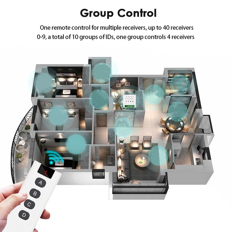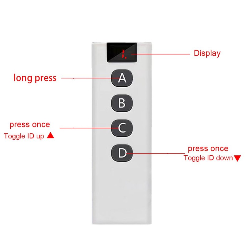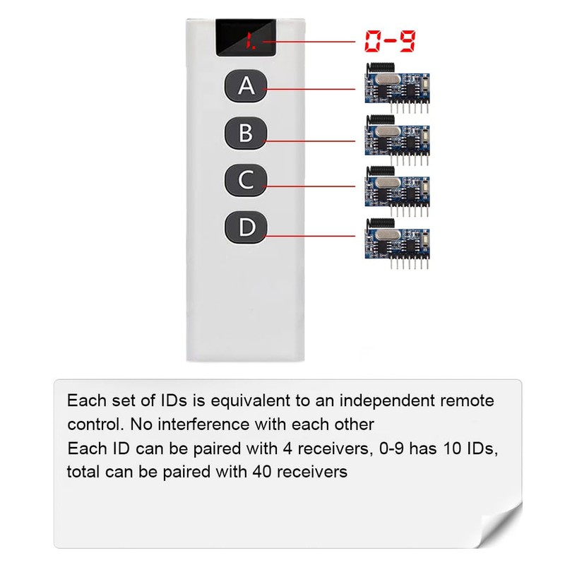 • One 10-in-1 remote control is equivalent to 10 independent 4-key remotes; can be controlled in groups without interfering with each other. Ideal for those who have multiple receiver modules but don't want to carry too many transmitters. Remote control switching method (from 0 to 9, each number represents a remote control): Press and hold the A key without letting go, then press the "C" key to increment; Press and hold the A key without letting go, then press the "D" key to decrement.