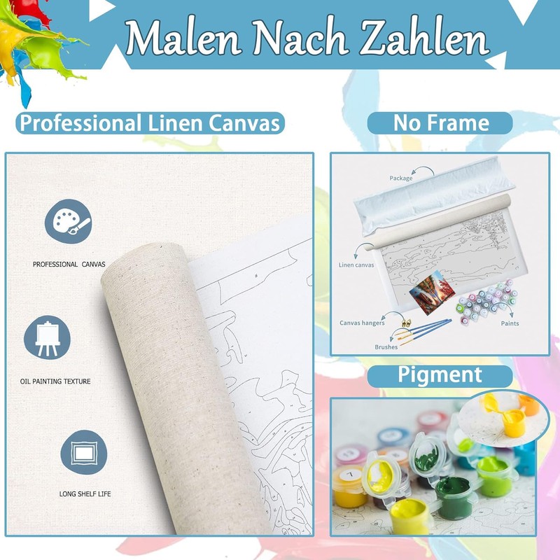- Environmentally friendly high-quality materials: with safe, environmentally friendly, high-quality acrylic paint, the colour is full, bright and highly opaque. The brush is made of highly elastic nylon material, so the painting process runs smoother. Textured art canvas for clear visibility and easy to follow instructions.