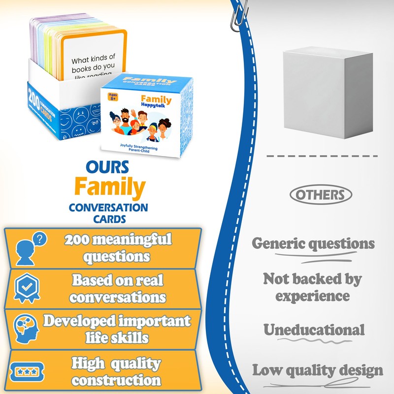 - Family Conversation Game cards: 200 fun and light-hearted questions designed to promote deep communication between parents and children. Themed packs in four colors. FOR TO KONW YOU; FOR FAMILY VIBES; FOR WHAT MAKES YOU,YOU; FOR FUN AND RANDOM correspond to four different types of questions and can be used in daily life or at work.