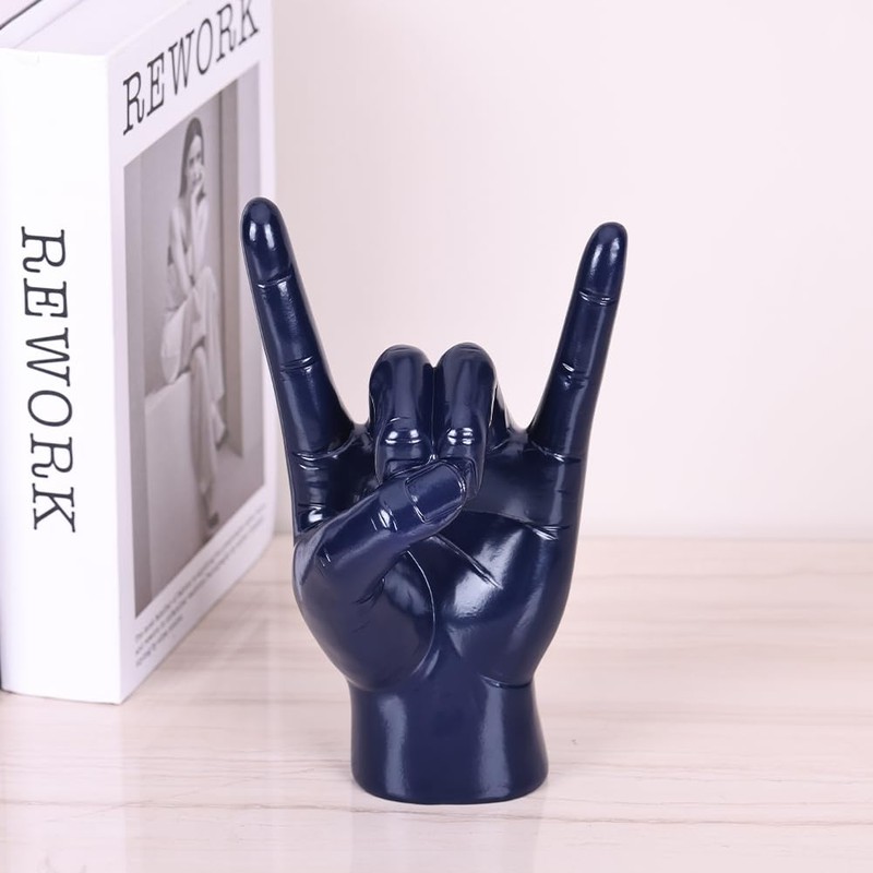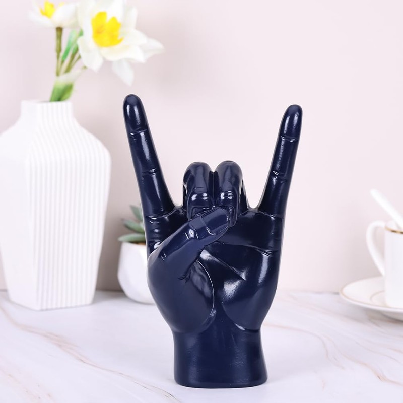 - Unleash the essence of rock and the heart of rhythm into your space with our captivating Blue Resin Rock On Hand Gesture Statue. A tribute to the fearless spirit of rock music, this statue stands as a symbol of passion, rebellion, and the timeless allure of melody.