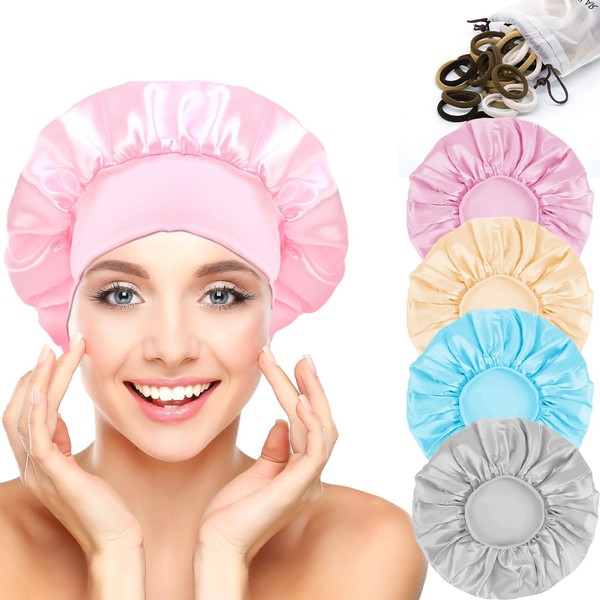 QianMu 4 Piezas Gorro de Seda para Dormir con 100 Ligas para Cabello, Gorro de Satin para Dormir Cabello Rizado Reutilizable y Cómodo, Gorra de Baño para Mujer con Banda Ancha Elástica (Plata + Rosa + Caqui + Azul claro)