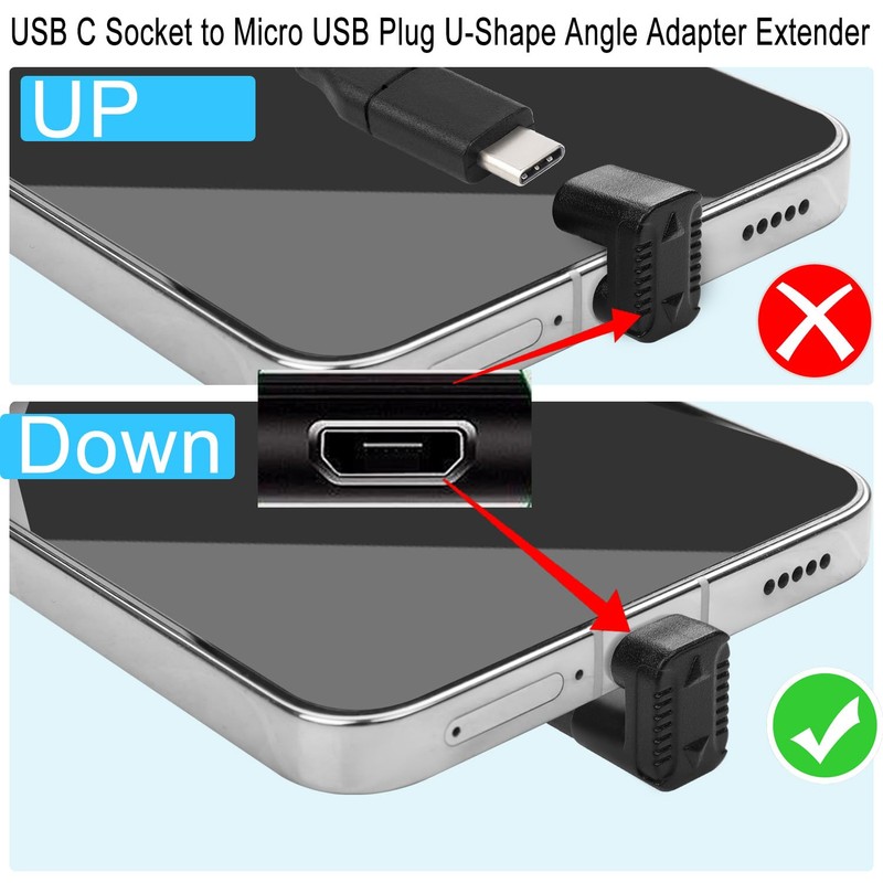 USB C Female to Micro USB Male U-Shape 180 Degree Angle Down Charging Data Connector. Convert your device's Micro USB port to USB C input, connect USB C cable for charging or data transfer.U-shape 180 degree angle down design, convenient for wiring in tight spaces. It is delicate and small, does not occupy space, can be left in the device port without interference. Used for cell phones, digital cameras, rechargeable batteries, speakers, Bluetooth headsets, MP3, MP4, car recorders, video cameras, game consoles and other Mico interface devices.