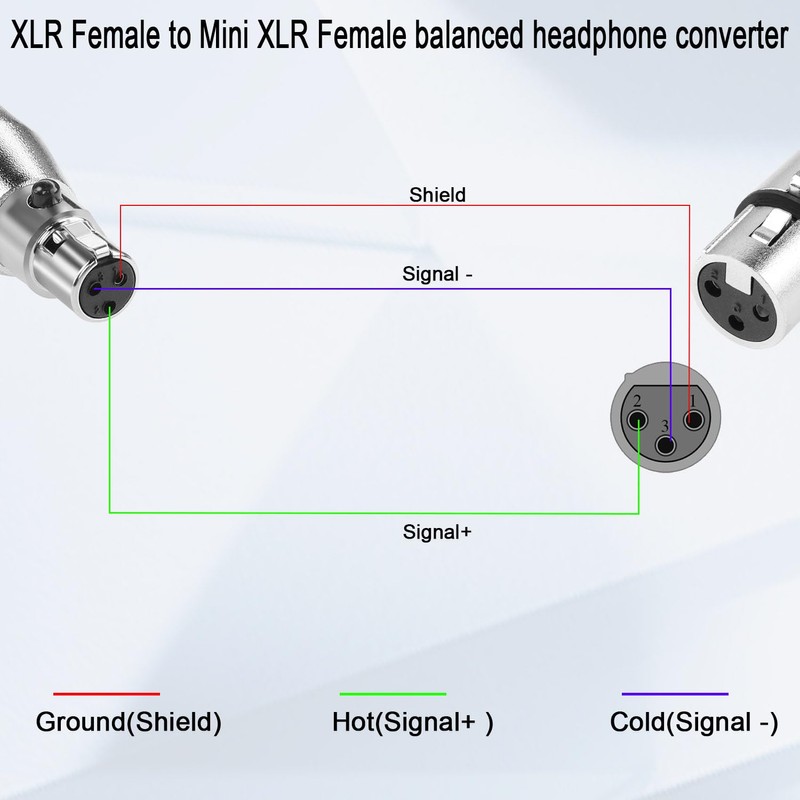 - 【Balanced Wiring】XLR female to Mini XLR female Balanced Headphone Audio adapter. 3Pin XLR and 3Pin Mini XLR pins are balanced wired with a straight through connection, Pin 1 - Ground (Shield), Pin 2 - Hot (+ Signal), Pin 3 - Cold (- Signal).