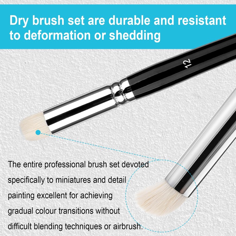 - 【Easy to Use】Dry brush miniature painting are easy to use. After use, ensure thorough cleaning by rinsing and gently cleaning the brush and place it in a ventilated place to dry. Rinse with clean water to keep the bristles soft and long-lasting.