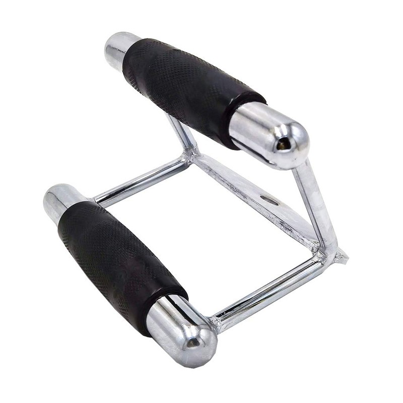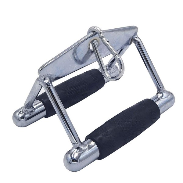 This deluxe Double D handle attaches to your home gym, Smith machine, etc Revolving hinge, rubber grips, Chinning triangle low roll cable handle. Great for seated row exercises to develop your back, shoulders, forearms, triceps, and biceps. Double D design allows you to exercise both arms at once. Made of top-quality steel with chrome finish to prevent the grip from corrosion and rust. Support up to 880 lbs (400 kg). Dimensions: 7 x 6 x 5 , weighs 5 lbs