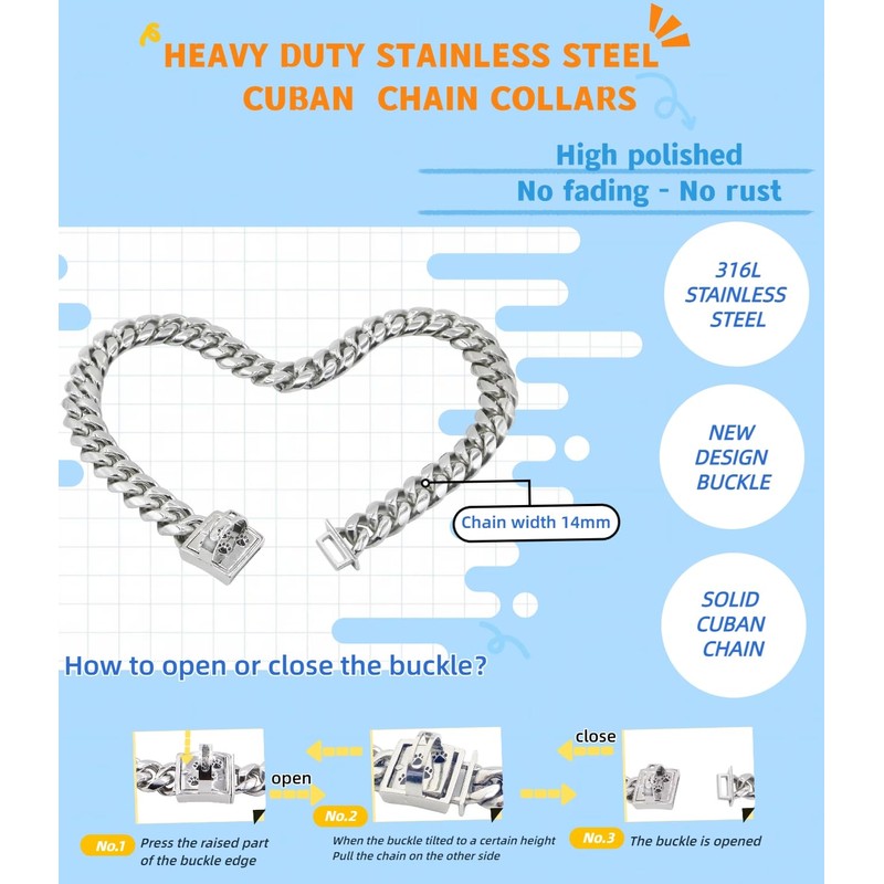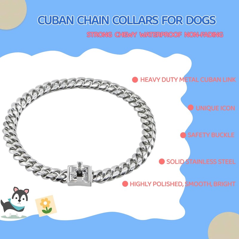 - 【Fashion Cuban Chain and Design Buckle】Featuring a stylish silver or gold Cuban link chain design, this collar not only does it serve its purpose of ruggedness but also adds a touch of style and elegance to your furry friend's appearance.The secure buckle guarantees that the collar stays in place,easy to open and lock, without any risk of accidental release,giving you peace of mind while walking your dog.