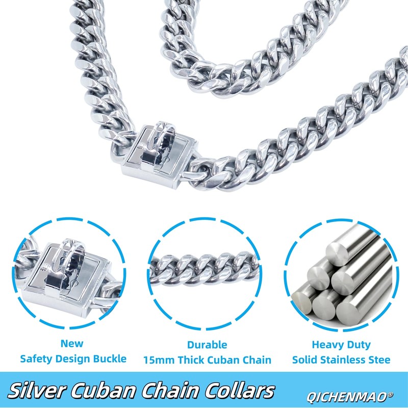 - Durable Construction: These dog collars feature a sturdy 15MM Cuban link chain made of high-quality stainless steel, ensuring durability and chew-resistance for large, medium, and small dogs. Waterproof and rust proof, this dog collar is built to withstand daily wear and tear, ensuring the safety of your pet and long service life. The stainless steel metal chain is sturdy and durable, making it easy for even the most lively dogs to handle. In addition, this collar is suitable for various climatic conditions, whether it is hot summer or cold winter, and can maintain its excellent performance.