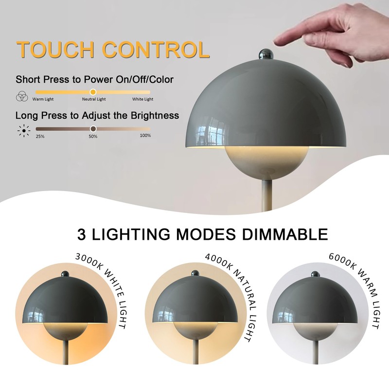 - Corded Night Light: This mushroom table lamp comes with a charging cable. You can easily connect the light to an electrical outlet. Table lamp size: 6.3 X 11 inches, cord length with switch :39". Note: The cord cannot be disassembled.Color temperature adjustment range: 3000K/4500K/6000K.