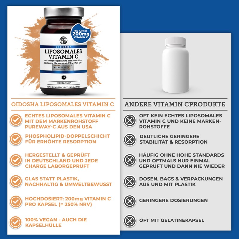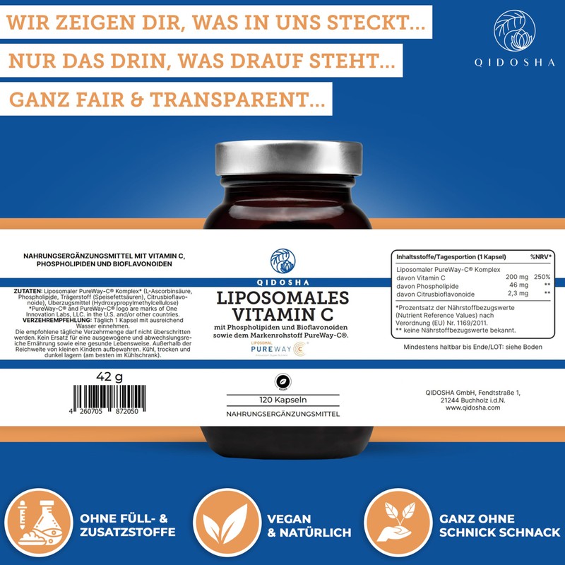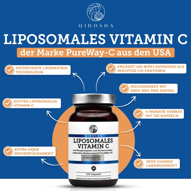 QIDOSHA® Vitamin C Komplex liposomal mit dem Markenrohstoff PureWay-C®, 120 Kapseln im Apothekerglas, Vitamin C liposomal plus Bioflavonoide, deutsche Fertigung, jede Charge in externem Labor geprüft