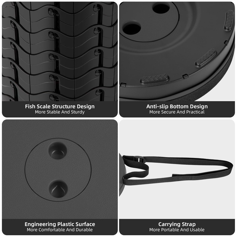 - Fish Scale StructureThe collapsible stool is made of high-density thickened PP material. And we use fish scale structure and high-precision buckle design to increase the strength, rigidity and stability of the folding chair. So our collapsible stool will be more sturdy and durable, with a load capacity of 400 pounds.