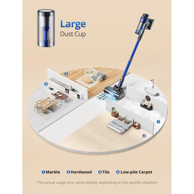 - 30Kpa Powerful Suction for Deep Cleaning: The cordless vacuum cleaner features 250W impressive suction power of 30Kpa, allowing it to effortlessly pick up dirt, dust, pet hair, and debris from various surfaces. Its efficient design ensures deep cleaning with ease, leaving your home spotless