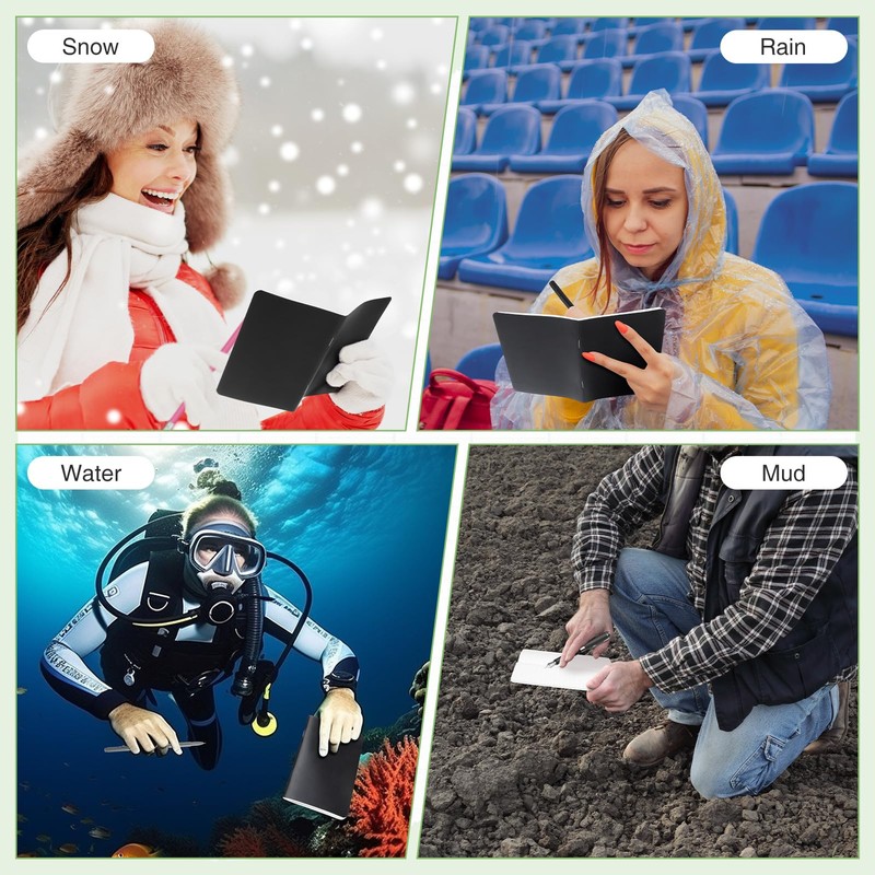 - Writing in the Rain: you can write in the rain with our waterproof pocket journal, you better use a pencil or all weather pen for your notes will stay intact; Standard ballpoint pens will work when paper is not wet; Water based inks will be falling down; Our all weather notebook are ideal for outdoor enthusiasts to carry with them; It can record camping data and tactics in time without worrying about hiking and camping in bad weather