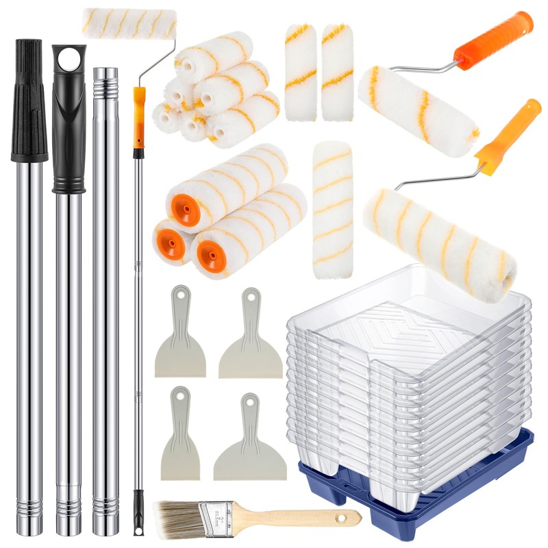 - Set Contents: paint roller kit include 9 Inch roller frame with 4 covers, 4 Inch Mini Roller Frame with 8 Covers, an extension pole, a plastic paint tray and 10 pcs disposable paint trays, a color separation paint brush, 4 different sizes cleaning knives