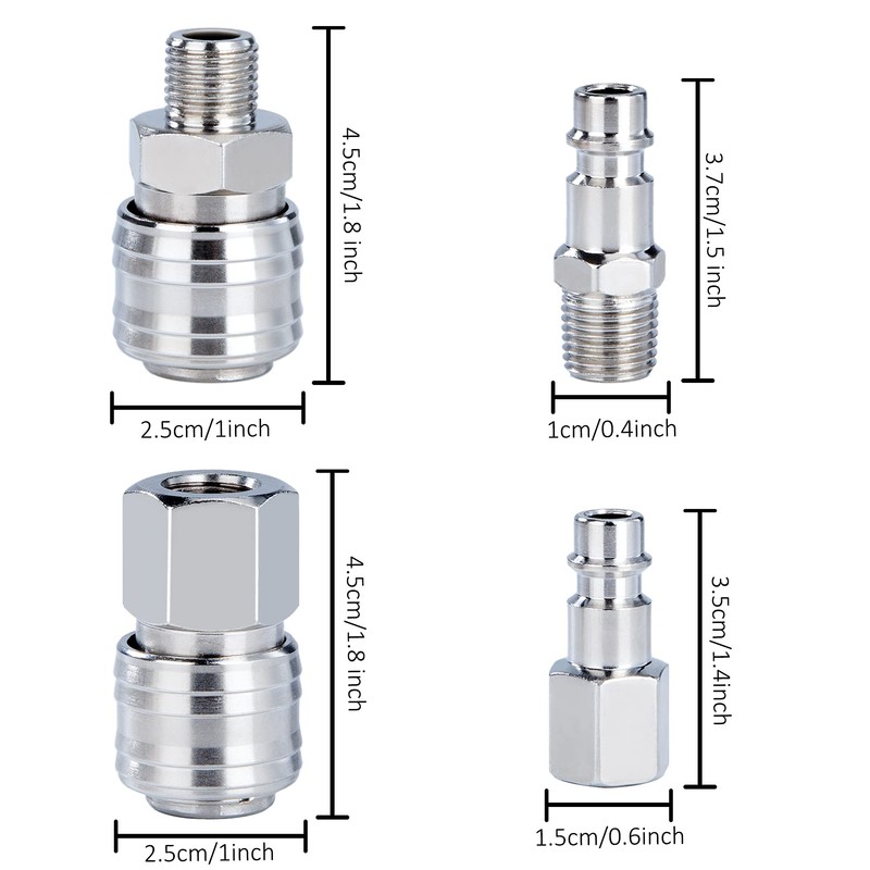 - Size: 1/4 inch BSP threaded hose connection: 1 piece male thread socket, 1 piece female thread socket, 4 pieces male thread, 4 pieces female thread