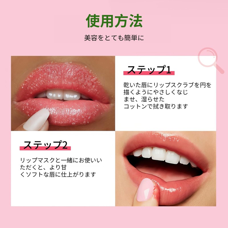 - How to use: Apply the lip scrub gently on the dry lips, and remove it with a damp cotton pad. Then you can make your lips softer and sweeter with the lip mask!