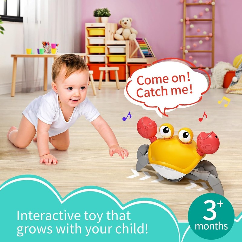 - Music Crab toy - crawling and sensor obstacle avoidance function, in the process of moving encountered obstacles, will move in the opposite direction in time. The lights and music are very attractive to children. Note: Do not use this toy in water or wet environment.